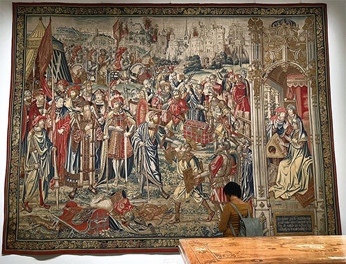 特展中最大的一件掛毯〈人的創造與墮落〉,收購於約1502年。這幅掛毯在規模、設計和材料上都是一流的,符合亨利七世購買它時的雄心壯志,是系列中之一。若十幅全掛上,會延伸三百多英尺。儘管其他歐洲皇室成員也購買了採用相同設計的掛毯,但亨利的掛毯是唯一一款採用金銀線編織而成的掛毯。亨利七世、八世兩代國王收藏的掛毯超過2500件,像這樣成組系列的大手筆相當於當時一艘戰艦的造價。而這種系列性的掛毯在都鐸王朝的收藏中有十幾組。