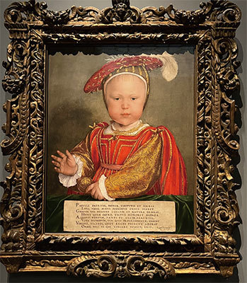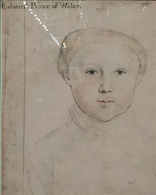 在愛德華還是嬰兒期,王室就用不同藝術的形式來打造這個未來的國王,小霍爾班畫愛德華的童年肖像(Edward VI as a child 1538)是一幅迷你版的亨利八世,連手勢也是經過設計的。肖像的下方用拉丁文寫滿了字,大意是鼓勵王子要「效法你的父親」之類的,是霍爾班送給亨利八世的新年禮物。這又是一張王室宣傳畫,相對霍爾班畫愛德華兒時的素描樸素無華,畫家能屈能伸。經歷歲月沉澱不管是為宣傳王朝的還是畫家信手捻來的畫,都已成為都鐸王朝的歷史文獻,大英的寶藏。