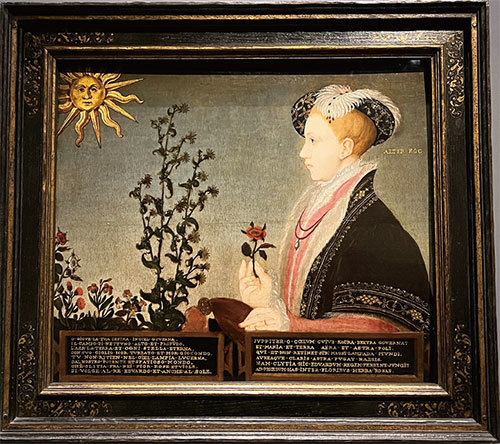 另一張畫愛德華側面像:手持象徵都鐸王朝的玫瑰,太陽照射著各種花草隱喻未來國王握著權柄。都鐸王朝的文藝復興與歐陸意大利的文藝復興最大不同是,都鐸王朝多是圍繞著王朝、君權、人像作畫,而意大利則是表現神與人的題材為主。服務於都鐸王朝的藝術家來自歐陸各地,各自的精湛技術與人文素養加上特殊的僱主與環境,成就了英國的文藝復興。
