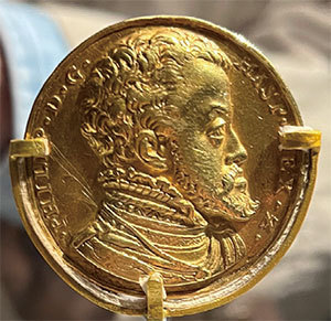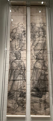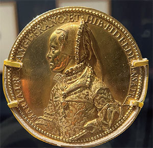 展覽中除了她的肖像,有張高長超過十尺的彩繪玻璃設計圖〈最後的晚餐〉與金幣頭像的鑄造,是為祝福她與西班牙國王菲利普二世結婚而訂製的,來自安特衛普的設計師。一對高大的設計草圖掛在會場很壯觀,策展人在分配作品與選件比例上很用心。