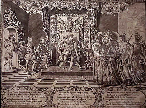 因此伊莉莎白女王有童貞女王之稱。傳說她曾告訴她的士兵「我的身軀雖是弱女子,但是我有一顆國王的心與胃」(I have the heart and stomach of a king)。不知是莎士比亞編劇裡給她寫的台詞,還是她真的說過這樣的話?她在位期間打敗曾向她求婚的西班牙國王菲利普二世,改寫了世界版圖的分配,她的御用畫家大量製作與都鐸王朝形象有關的銅版畫,這個時期的她與王朝有了強大的自信心。展場最後一間掛滿了一張張不同時期她的肖像,這些畫像證實了她完成都鐸統治的意志與使命。