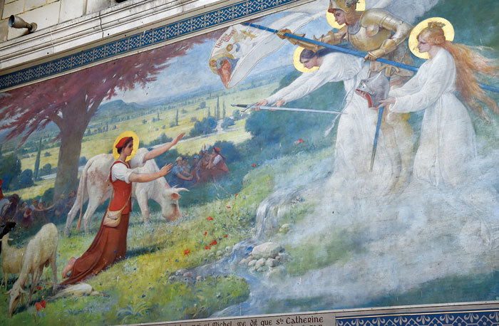 牧羊女貞德十六歲時,遇見天使,從而得到上帝的啟示,要她收復當時英國人占領的法國土地。圖為法國東部Domremy-la-Pucelle教堂內描繪貞德一生的壁畫。(Jean-Christophe Verhaegen / AFP)