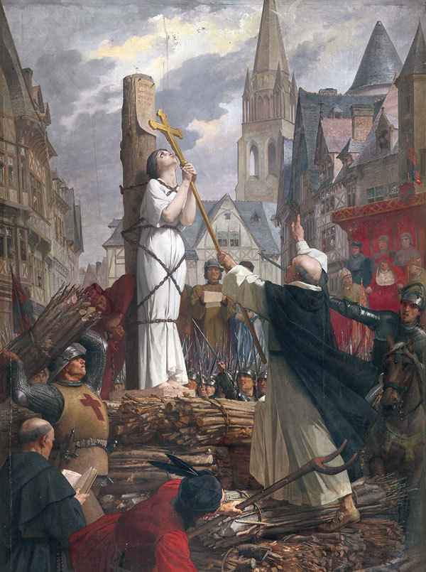 1431年5月30日一早,盧昂市的老廣場,搭起了火刑台,上面堆滿了柴火。因審訊和拷打而虛弱不堪的貞德,被捆綁在柴垛上,火焰突然升騰起來,在烈焰中,貞德大聲呼喚起上帝、天使和聖女的名字。「我聽到的是天主的旨意!我聽到的聲音絕不會背棄欺騙我!」