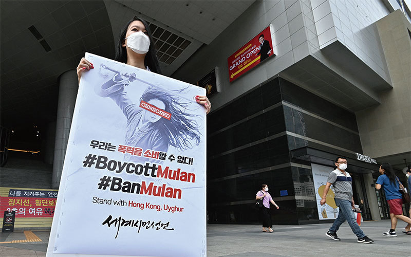 2020年9月17日,韓國首爾一名抗議者在電影院外呼籲抵制迪士尼真人版《花木蘭》,並聲援香港的民主抗議活動。