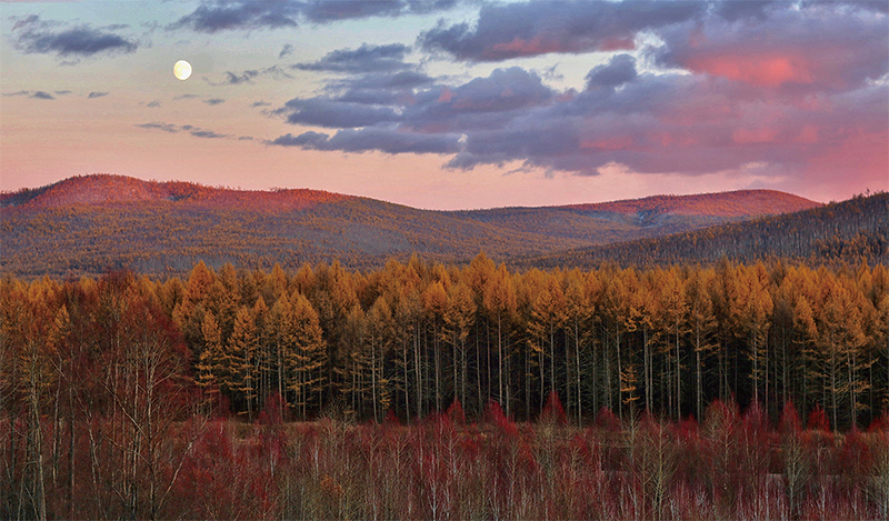 中共的糧食生產與林業爭地,導致森林資源遭受破壞,大興安嶺在中共統治下,森林邊緣向北退縮了200公里。圖為2017年秋,大興安嶺根河濕地附近的森林。(Charlie Fong/維基百科)