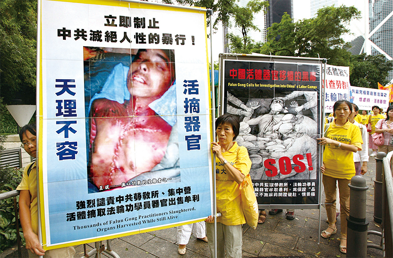 法輪功的出現,讓中國人恢復了對天命和神佛的信仰,因此受到中共最殘酷的鎮壓,包括大規模活摘法輪功學員器官等。圖為2006年6月28日,法輪功學員在香港遊行譴責中共活摘器官滔天罪行。(Mike Clarke / AFP)