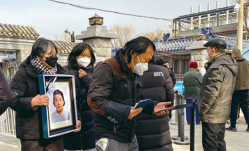 英國健康數據公司Airfinity 2022年12月30日發布報告說,中國每天有1.1萬人染疫死亡。圖為2022年12月20日,家屬在北京火葬場拿著過世親人的照片。(Noel Celis / AFP)