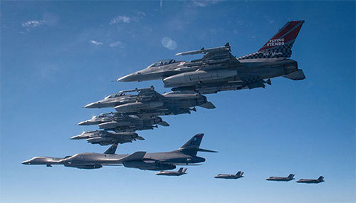 中俄朝三方不斷挑釁,2022年11月30日,兩架中共軍機與六架俄羅斯軍機進入韓國的航空識別區,韓國戰機緊急升空伴飛。圖為2022年11月19日,美韓在韓國防空識別區內聯合演練。(美國空軍)