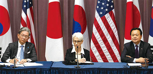 2023年2月13日,美日韓的高級外交官員在華府會晤,討論加強印太地區和世界安全的合作計畫,共同回擊中共對國際秩序的挑戰。(Jim Watson / AFP)