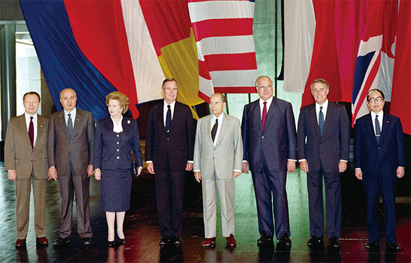 六四事件後,1989年7月G7法國峰會在討論對中共嚴厲譴責並實施進一步經濟制裁問題時,遭到日本阻擋。日本提出只有避免孤立中國,才能使其走向政治改革。圖右一為日本首相宇野宗介。(Dominique Faget / POOL / AFP)