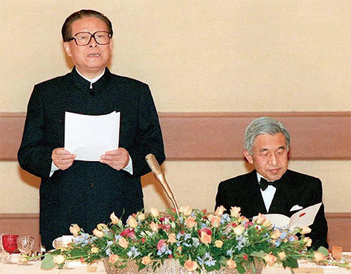 1998年11月26日,江澤民作為國賓訪日,日本天王、王后在王宮設晚宴招待,約150名政要、各行業領袖出席了晚宴。天王致歡迎辭時說:希望與中國携手解決面臨的問題,為地球環境的改善、人類的福祉、世界和平繼續做出貢獻。對此,江在致辭時,始終緊綳面孔,並嚴厲地回應道:日本軍國主義走上對外侵略擴張的錯誤道路,給中國人民和亞洲其他國家的人民帶來極大災難……我們要永遠汲取沉痛的歷史教訓……