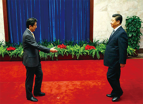 2014年11月,在兩國關係極度緊張,幾乎到了要爆發衝突的時代背景下,日本首相安倍晉三藉在北京召開的APEC會議的機會,實現了與習近平的破冰會面。習近平作為東道主,需要會見參加會議的各國元首,因此才見了安倍。從當時的電視畫面看,安倍很拘謹但卻面帶笑容地走上前去與習近平握手,習近平則表情嚴厲,對安倍的寒暄沒作任何回應,聽完翻譯的話後,就直接將冷峻的臉轉向前方。握過手後,安倍似乎還有話要說,但習近平則將臉轉向另一側,安倍連續兩次試圖搭話,但習近平就是視而不見,令安倍十分尷尬、狼狽,只好默默離去。