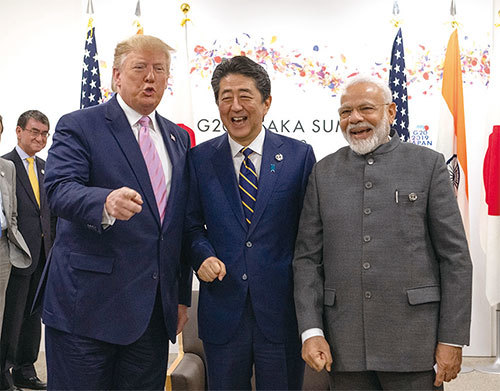 安倍提出「自由、開放的印太構想」,扭轉了世界對亞洲過往以中國為中心的觀點。圖為2019年G20大阪峰會時,美國總統特朗普(左),日相安倍晉三(中)與印度總理莫迪合影。(Carl Court / POOL / AFP)