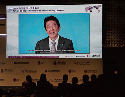 2021年12月1日台灣智庫召開研討會,安倍晉三發表視訊演講,指出台灣有事就是日本有事,也是日美同盟有事,北京尤其是習近平千萬不要誤判。圖為2021年12月14日台美日三邊印太安全對話在台北舉行,安倍晉三以預錄的方式為開幕典禮致詞。(中央社)