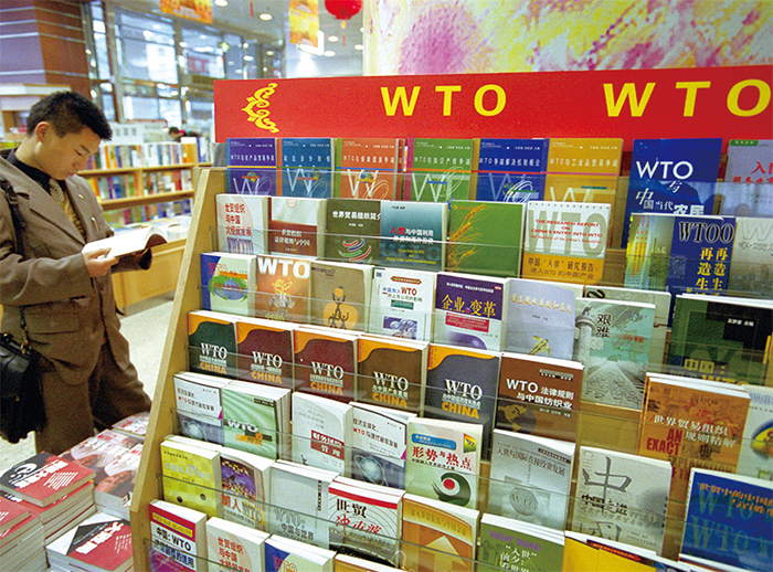 數十年來中國經濟的大發展是因為加入世貿,獲得全球的顧客,而不是靠「供給側改革」實現的。圖為2001年11月5日,北京一家書店的世貿專區。(Peter Rogers / Getty Images)
