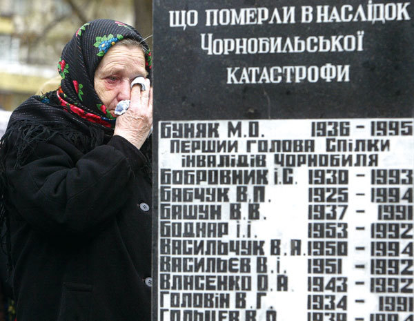 當蘇聯民眾得知切爾諾貝利核洩露的真相後,蘇聯政府的信譽全面崩塌。圖為2005年4月26日一名烏克蘭婦女在切爾諾貝利事故遇難者紀念館的墓碑前哭泣。(Sergei Supinsky / AFP)