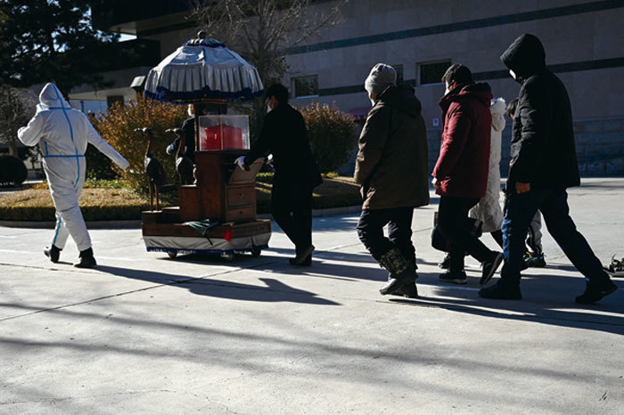 中共放棄「清零」惡政,突然放開的措施又讓中國人經歷了二次浩劫:全國感染,醫院擠爆,死亡億萬,殯儀館的慘景堪比人間地獄。圖為2022年12月22日,在北京的火葬場,家人跟在裝著親人骨灰的骨灰盒後。(STR / AFP)