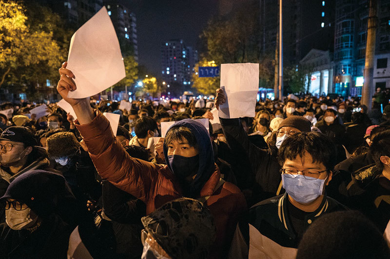 2022年11月27日,北京民眾在夜間聚集,高舉白紙表達抗議。(Kevin Frayer / Getty Images)