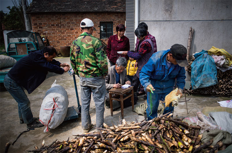 中共新上任總理李強提出「四千精神」。中國經濟之所以能夠高速成長,基本依靠「小農經濟」。圖為2017年4月12日浙江省臨安市太湖源農家竹筍賣給小販。(Johannes Eisele / AFP)