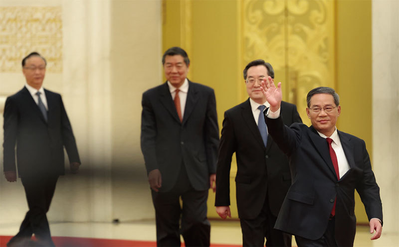 2023年3月13日,中國國務院總理李強(右一)和四位副總理出席人大會後記者會。(Lintao Zhang / Getty Images)