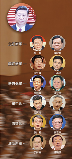 《新紀元》周刊在2018年4月發表了〈揭祕習家軍的六大派系〉的文章,稱習近平在拿下大量江派高官的同時,重用在福建、浙江、上海等地任職時的舊部,以及清華系校友、老家陝北官員,建立了「之江新軍」、「閩江新軍」、「新西北軍」、「軍工系」、「清華系」、「浦江新軍」等六大親信班底。五年後回頭看這個分析,發現新上位者都在這個名單上。