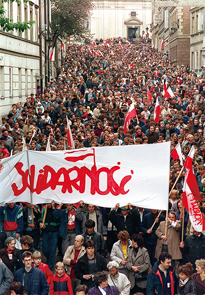 1989年6月4日,波蘭團結工會贏得大選,推翻波蘭共產政權,拉開東歐劇變的序幕。圖為1989年5月1日,團結工會組織的華沙街頭示威。(Druszcz Wojteic / AFP)