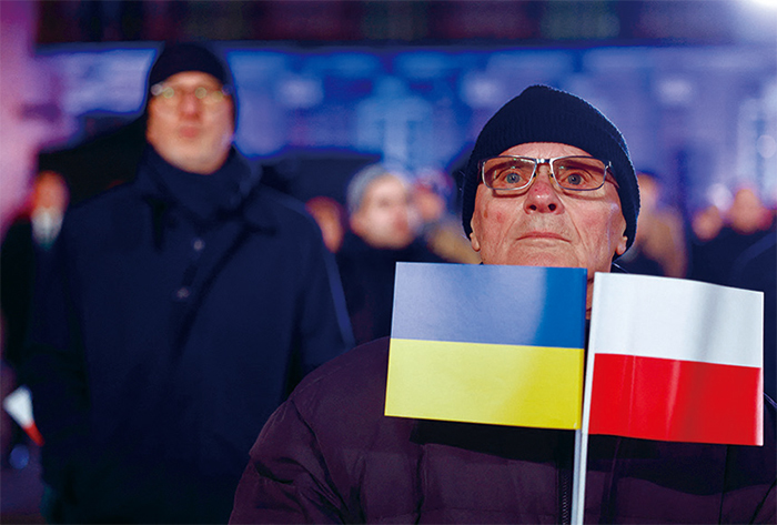 如果烏克蘭和波蘭成立2.0版的波立聯邦,就不再有北約東擴的概念了,北約已完全與俄羅斯接壤。圖為2023年4月5日,波蘭華沙王家城堡內,民眾聆聽澤連斯基和安杜達演講。(Wojtek Radwanski / AFP)