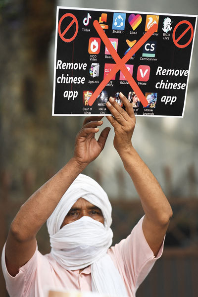TikTok的數據流經中國服務器,因此印度已禁止TikTok。圖為2020年6月30日印度新德里民眾敦促刪除中國應用程序。(Jim Watson / AFP)