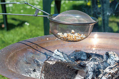 1800年代,美國人用多種方法自製爆米花,較流行的方法是將玉米粒裝入長木柄金屬盒中用明火爆裂。圖為在明火中自製爆米花。(Shutterstock)