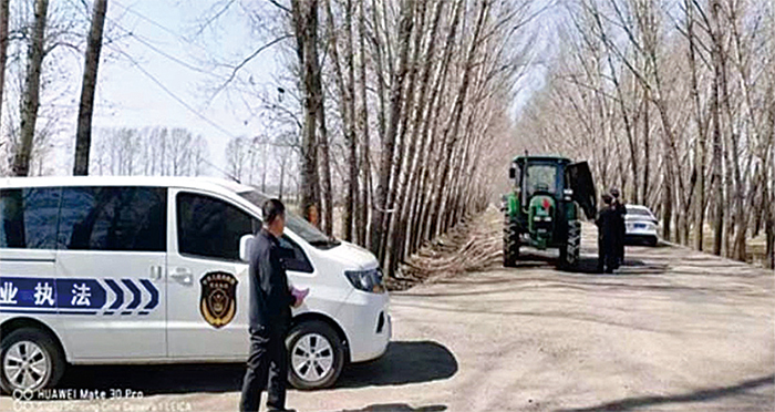2023年4月,黑龍江省寶清縣「農管」打著「保春耕」的旗號,攔查忙著春耕的拖拉機。(網頁截圖)