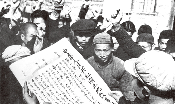 中共奪權後,毛澤東發動一場血腥的政治運動——土改,目的是把共產主義意識形態強行灌入不受官方管控的農民腦中。圖為土改工作人員向農民宣傳《土地改革法》。(公有領域)