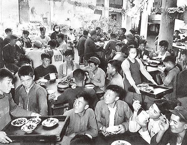 中共搞人民公社「吃大鍋飯」,農民自己無法在家裡做飯,必須到村里食堂吃飯,結果浪費了無數糧食。圖為1959年人民公社的公共食堂。(公有領域)