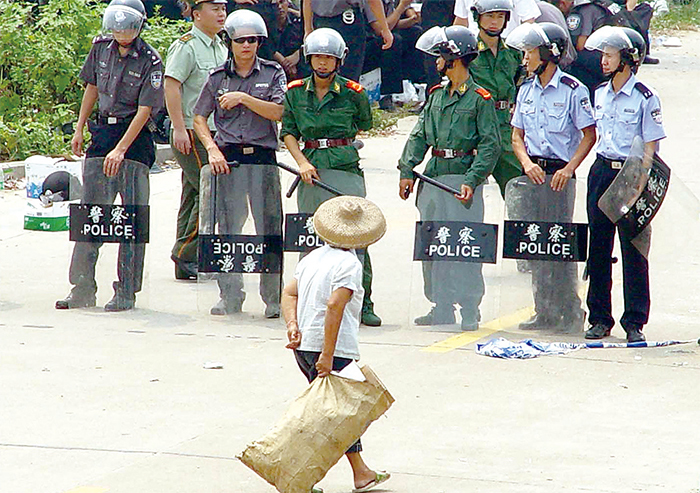 習近平說過:中國人民是惹不得的,惹翻了是不好辦的。如今北京卻推出「農管」惹翻了農民,這無疑是個凶兆。圖為2005年9月12日中共出動上千警力鎮壓廣東番禺太石村民罷官事件。(AFP)