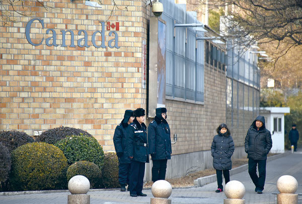 2018年,盧沙野出使加拿大期間,將孟晚舟的被捕歸結於「白人優越感作祟」。圖為2018年12月10日,中國警察在加拿大駐北京大使館外站崗。(Greg Baker / AFP)