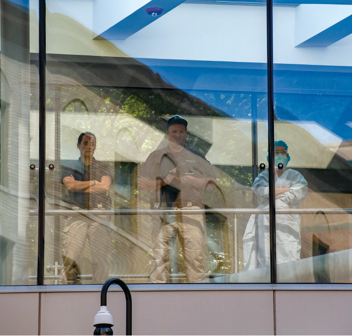 2022年9月18日,醫務人員和警察在波士頓兒童醫院外觀看跨性別兒童治療集會的示威活動。(Joseph Prezioso / AFP)