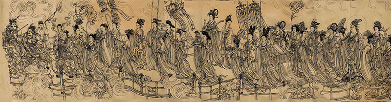 當徐悲鴻偶爾得到《八十七神仙卷》的時候,甚至懷疑冥冥中就是要他得到的。那裡面以道教故事為題材,純以線條表現出神仙出行的宏大場景。根根線條都表現了無限的生命力。仙樂聲中眾神仙腳踏祥雲,御風而行。