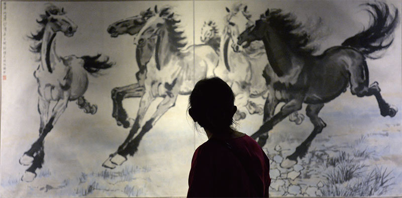 徐悲鴻最擅長畫馬。他講求對象的解剖結構、骨骼的準確把握。圖為2014 年6 月,北京一家博物館展出徐悲鴻畫作。