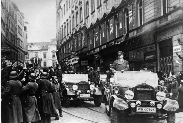 希特勒深信人們缺乏對上帝的信仰、無力抗拒納粹意識形態,他才能夠令德國人不再對自由民主有絲毫的嚮往,進而讓全世界捲入大戰。圖為1939年3月15日,希特勒和德國軍隊在布拉格閱兵。(France Presse Voir / AFP)