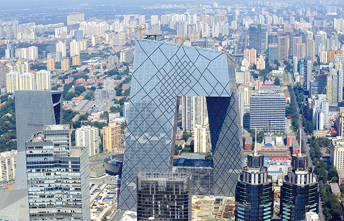 央視大樓外觀如同倒寫的U字型,型似一條「大褲衩」。(Goh Chai Hin / AFP)