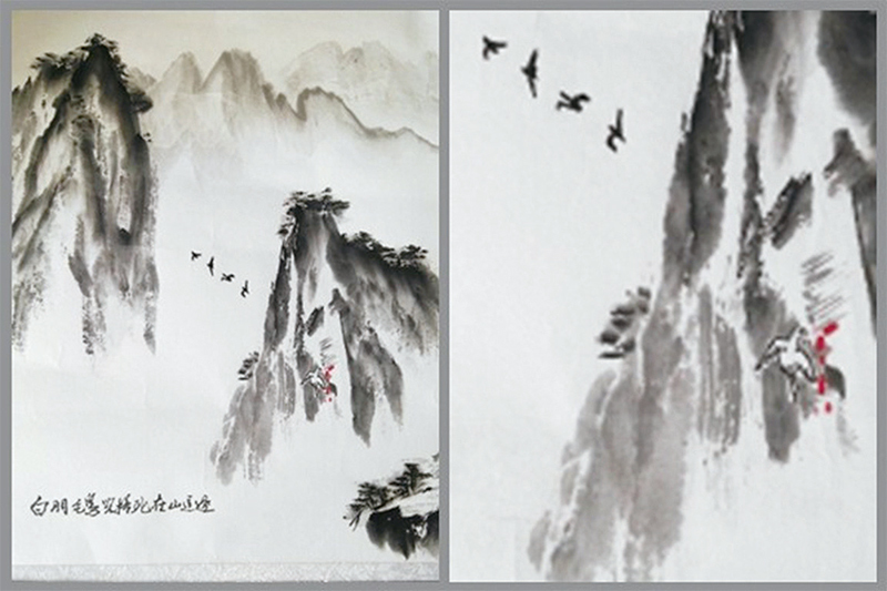最後一張圖是預言中共如何滅亡的,圖形很簡單,在兩座山峰中間的山坳上空,先後飛過去四隻黑顏色的鳥兒;最後一隻白顏色的鳥兒在右邊山峰的半山腰被撞死,血濺峭壁,正向山下墜落。