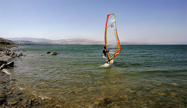 以色列加利利海的底部,坐落著一個巨大的神祕建築結構,可能有9500多年的歷史。圖為2006年7月25日,一名男子在以色列的加利利海衝浪。(Yoav Lemmer / AFP)