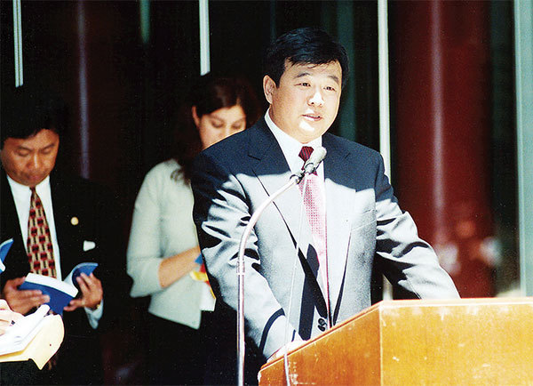 1999年6月25日,李洪志先生在接受美國伊利諾州州長、州財政部長和芝加哥市長嘉獎的頒獎儀式上講話。(明慧網)