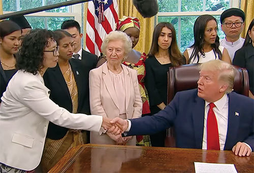 2019年7月17日,特朗普總統在白宮橢圓形辦公室會見來自17個國家的27位宗教迫害倖存者,其中包括來自中國的法輪功學員張玉華女士。這是美國總統第一次在白宮正式與遭受中共迫害的法輪功學員會見。