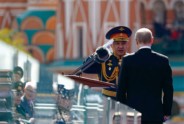 2023年5月9日,俄羅斯國防部長紹伊古在莫斯科市中心紅場舉行的勝利日閱兵式上向總統普京致敬。(Dmitry Astakhov / SPUTNIK / AFP)