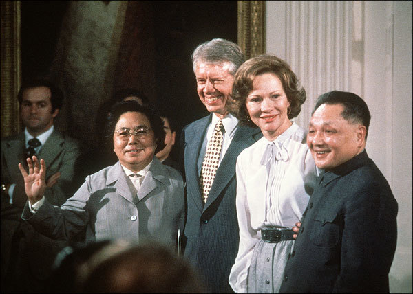 1979年1月28日鄧小平展開9天的訪美行程。圖右起鄧小平、美國第一夫人羅莎琳.卡特、美國總統卡特和鄧小平的妻子卓琳在華盛頓白宮。(Consolidated Pictures / AFP)