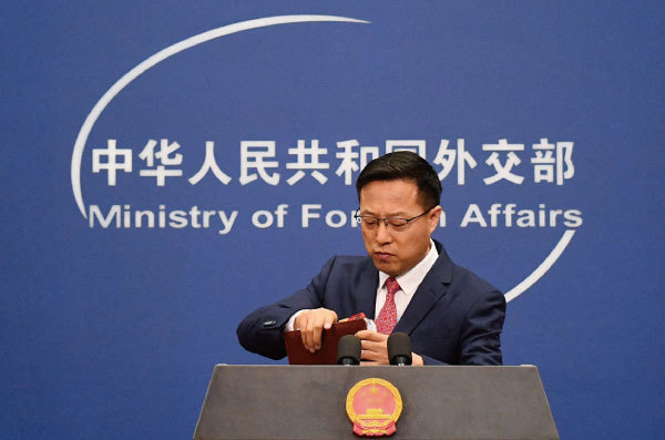 克林頓們等到卻是,中共外交官們肆無忌憚和咄咄逼人的戰狼叫囂。圖為2020年4月8日中國外交部前發言人、戰狼代表人物趙立堅出席記者會。(Greg Baker / AFP)