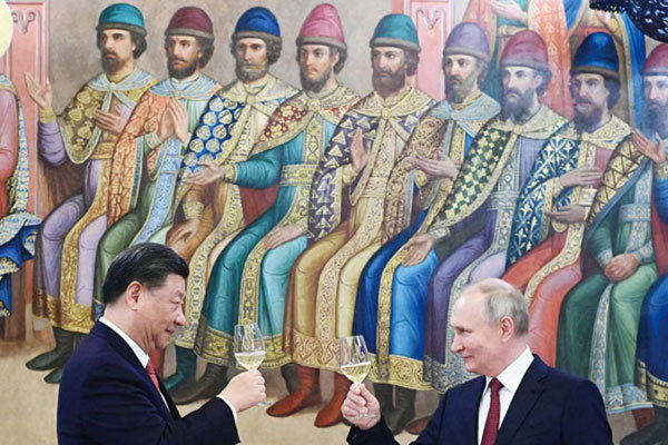 當年的蘇聯已變成俄羅斯。而印度選擇了美國,中共則選擇了俄羅斯。圖為今年3月21日,俄羅斯總統普京和習近平在莫斯科克里姆林宮會談後舉行的招待會上舉杯。(Pavel Byrkin / Sputnik / AFP)