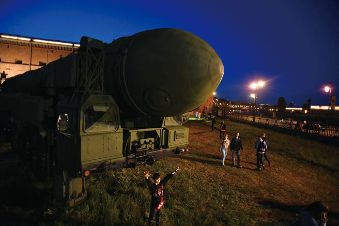 彈道導彈可以攜帶核彈頭。圖為2023年5月,俄羅斯聖彼得堡砲兵軍事歷史博物館展示的俄羅斯白楊洲際彈道導彈。