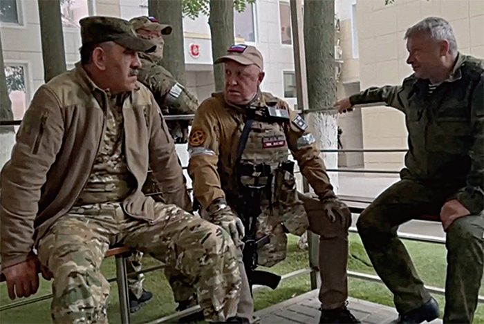 在瓦格納軍隊向莫斯科行軍過程中沒有遭遇阻擋,反而受到一些俄羅斯軍事單位的同情和明裡暗裡的配合。圖為6月24日,普里戈津(中)和俄羅斯國防部副部長葉夫庫羅夫(左)在俄羅斯國防部總部內交談。(Handout / Telegram / @razgruzka_vagnera / AFP)