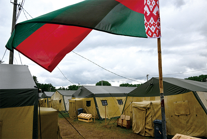 2023年7月7日,白俄羅斯莫吉廖夫州一軍事定居點內的帳篷營地。據白俄羅斯國防部官員稱,該營地可作為瓦格納戰士的安置地點之一。(Alexander Nemenov / AFP)